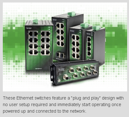 Stride Ethernet switches, designed for the industrial environment, survive extreme temperatures, as well as noisy industrial power. Meeting hazardous location requirements (Class I Div. 2), and the IEC60068-2 standard for vibration resilience, the Stride switches provide years of reliable connectivity in applications too tough for commercial grade switches.