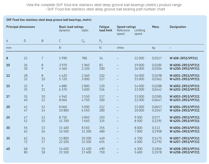 SKF Food Line stainless steel deep groove ball bearing features include: