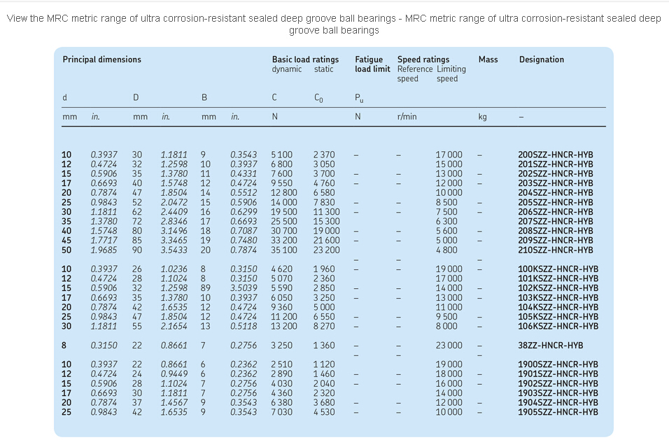 Helping to reduce unplanned downtime, maintenance costs and more, these bearing solutions provide a significant breakthrough in extending bearing life – along with the ultimate corrosion resistance. Applications in extreme, harsh and highly corrosive environments These innovative bearings are ideal for applications in freezing, abrasive, wet and corrosive environments. For example, MRC Ultra corrosion-resistant sealed deep groove ball bearings extended the life of an ice cream manufacturer’s hardening tunnel by up to 5 years, reducing maintenance time and costs. Read more about this case story here. Key features for food safety and corrosion resistance High nitrogen corrosion resistant stainless steel technology (HNCR) is used for the bearing inner and outer rings. Combined with ceramic balls, the corrosion resistance and fatigue life of these bearings is far superior to bearings made from 52100 and 440C stainless steels (Fig. 1). (See test in brochure link to the right.) The seals are made from synthetic rubber, coloured blue for optical detectability should any fragments enter the food stream, and complying with US Food and Drug Administration regulations (FDA)** High quality grease, suitable for typical food and beverage application conditions registered by NSF as category H1* View the MRC metric range of ultra corrosion-resistant sealed deep groove ball bearings