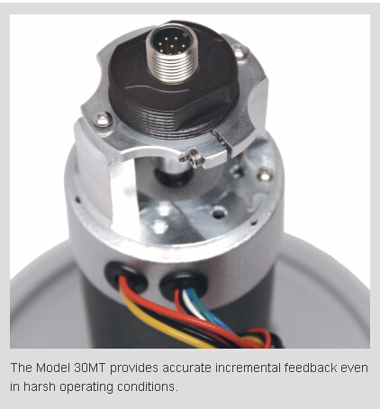 The Model 30MT is a versatile, cost-effective solution for non-contact, end-of-shaft rotary feedback in commercial, industrial and non-industrial applications. Some examples are: servo or stepper motor control; mobile equipment speed and steering sensing; timber processing machinery; studio and stage equipment; solar panel positioning; vending machines; rotary valve positioning; punch presses; and robotics.