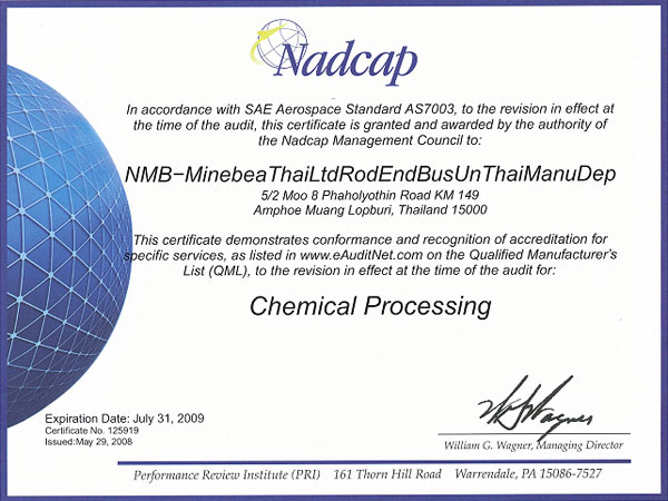 The Company's MPA Division obtained Nadcap certification in 2007 for "non-destructive inspection" and "heat treatment process" for manufacturing bearings for aircrafts. Obtaining certification for the "chemical treatment process" necessary for stainless bearings for aircrafts will enable Thailand to join the UK, United States and Japan in integrated manufacturing stainless bearings for aircrafts.