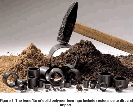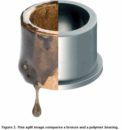 The third, lubrication-free option is to use injection-molded solid polymer bearings. These bearings are made with a mixture of thermoplastic materials, embedded reinforcing fibers and solid lubricant. The fiber-reinforced materials maintain the bearing's strength and resistance to high forces and edge loads.