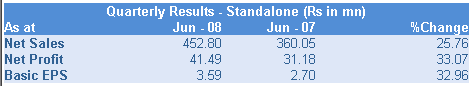 The company`s earnings per share, after extra ordinary items, stood at Rs 3.59 for the quarter ended June 2008 as against Rs 2.70 for the same period last year, registering an increase of 32.96%.