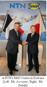 During Mr. Accoyer's visit, discussion and opinion were exchanged on a wide range of topics covering global market development, revitalization of industry and the economy through collaboration between Japan and France, and strengthening energy-creating partnerships such as NTN's venture with SNR. Regarding synergies with SNR, discussion centered on 1) collaboration in the industrial machinery sector (capital expenditures to the industrial machinery sector in France and partnerships with NTN's manufacturing bases at Kuwana and Mie), 2) sales increase in Europe and other markets where growth is expected, and 3) promotion of technical integration and partnerships in research and development(*).