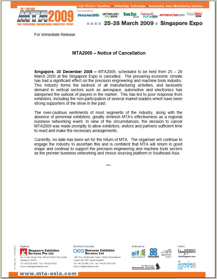 MTA2009 scheduled to be held from 25 – 28 March 2009 was canceled