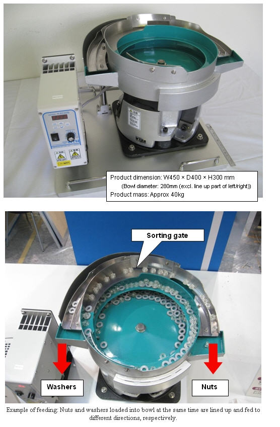 NTN Corporation (hereafter NTN) has developed a “2 way sorting feeder (bowl type)”. This new product enables various kinds of part feedings by means of integration of basic technology on NTN's conventional “Mono-drive 2 way feeder TM*” and a new part feeding mechanism (a 1st in the parts feeder industry).