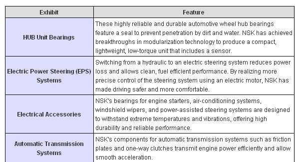 The theme for the NSK booth will be “Conserving the Global Environment.” On display will be cutting-edge NSK products that improve fuel efficiency and deliver environmental advantages thanks to their compact size, light weight, low torque, super-sealed technologies , and long service life. Featured products will include automotive bearings, electric power steering (EPS) and automatic transmission (AT) systems, and other products for automotive applications.