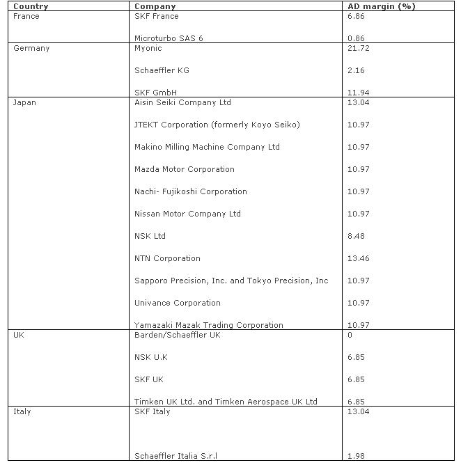 Furthermore, the DOC has rescinded the reviews for the following companies: SNR Roulements (France), RWG Frankenjura-Industrie (Germany), Flugwerklager GmbH (Germany), SNR Walzlager GmbH (Germany), Asahi Seiko Co. Ltd. (Japan), Nippon Pillow Block Co., Ltd. (Japan), Japanese Aero Engine Bearings Corporation (Japan).