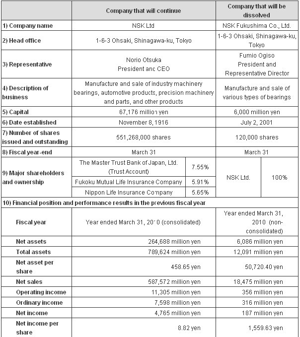 There will be no change to NSK's company name, head office location, representative, description of business, capitalization or fiscal year as a result of this merger.