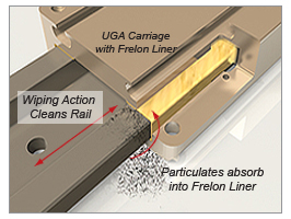 Comprised of a simple, two-piece rail and carriage assembly, Uni-Guide products facilitate quick system integration without the mounting components and alignment necessitated by other linear slide products. These competing products, such as re-circulating ball or polymer insert linear slides, use assemblies with multiple rails and components, and require painstaking alignment to ensure uniform parallelism across all assembled rails and carriages. The Uni-Guide family promotes ease of installation by machining two parallel rails in one profile. The one-piece carriage design also simplifies assembly by directly fitting onto the rail without fasteners—saving the end user on cost and reducing tolerance stack-up.
