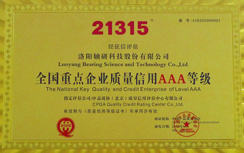Luoyang Bearing Science & Technology Co., Ltd awarded 《The National Key Qualilty and Credit Enterprise of Level AAA》in this September and the bronze plaque, valid for three years.