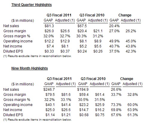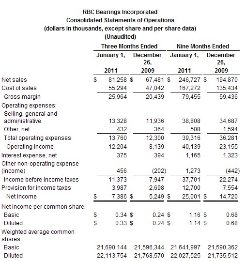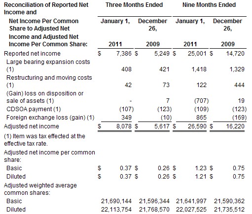 For the third quarter of fiscal 2011, the Company reported net income of $7.4 million compared to net income of $5.2 million in the same period last year. Excluding the after-tax costs associated with the expansion into large bearing products, restructuring and moving costs, the foreign exchange loss offset by the CDSOA payment, net income increased 43.8% to $8.1 million compared to $5.6 million for the same adjusted period last year.