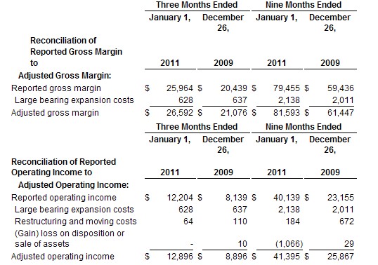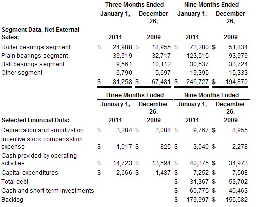For the nine month period ended January 1, 2011, the Company reported operating income of $40.1 million compared to $23.2 million for the same period last year. Operating income excluding costs associated with the expansion into large bearing products and restructuring and moving costs offset by a net gain on sale of assets was $41.4 million for the nine month period ended January 1, 2011 compared to $25.9 million for the same adjusted period last year. Operating income as a percentage of net sales excluding these charges was 16.8% for the nine month period ended January 1, 2011 compared to 13.3% for the same adjusted period last year.