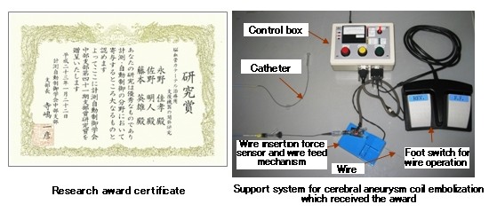 [Reason for award] The award was given for R&D on support systems for cerebral aneurysm coil embolization (a type of catheterization) because the winners published two papers in the journal of the Society of Instrument and Control Engineers, two papers in medical engineering journals, and 4 papers in medical journals, and thus the developed support system was recognized to have scholarly value in terms of engineering, and great potential by medical societies.