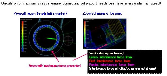 Dynamic analysis generally has only limited use during the design stage due to the immense figures and complex steps required for obtaining each set of data from bearings when they are in motion, and has not been used to calculate stress in the cage itself until now. Measurement of forces acting on the cage during testing has also not been conducted in practice due to difficulties faced for sensing.