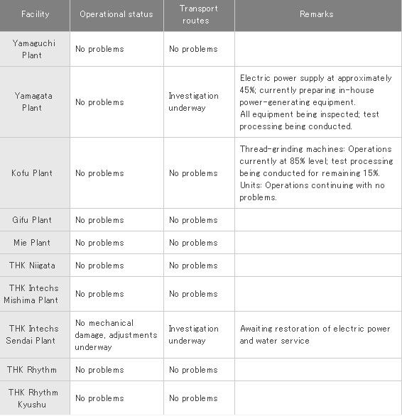 Earthquake's Impact on THK Production Division (Updated March 14, 2011, 6:00 p.m.)
