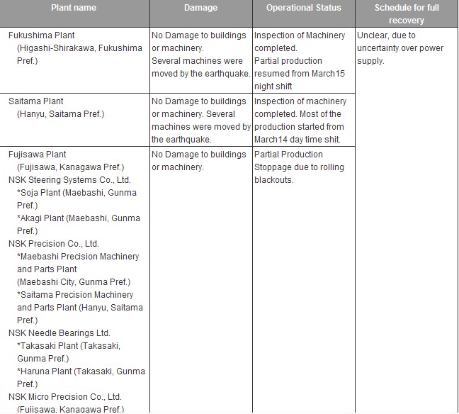 Update: Status of NSK Group following Northeast Japan Earthquake