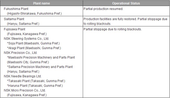 Update: Status of the NSK Group following the Northeast Japan Earthquake (as of March 18)
