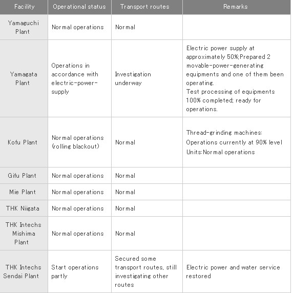 Earthquake's Impact on THK Production Division (Updated March 21, 2011, 10:00 a.m.)