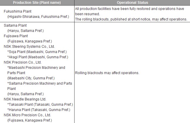Update: Status of the NSK Group following the Northeast Japan Earthquake (as of March 23)