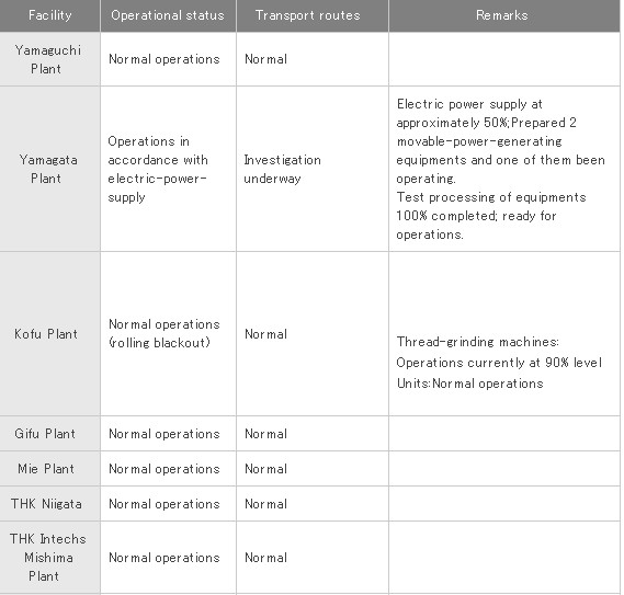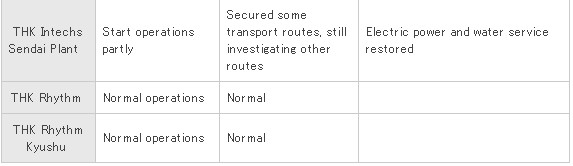 Earthquake's Impact on THK Production Division (Updated March 23, 2011, 5:00 p.m.)