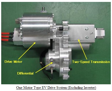 The drive systems of common one motor EV use a reduction gear without a transmission function; therefore, large drive motors were used in order for the acceleration performance at low speeds, and the rotating performance while running at high speeds to be compatible. For this reason, sufficient installation space was also required.