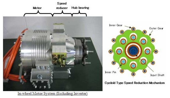 The world's lightest “In-wheel motor system” developed by NTN, promotes improvement and high performance of the modular products, where the in-wheel motor is equipped with a cycloid speed reduction mechanism, hub bearings and various sensors. Considering safety the top priority, reliable and stable running was realized by incorporating a system (including an inverter) which properly controls the motor driving force, based on the information from sensors.