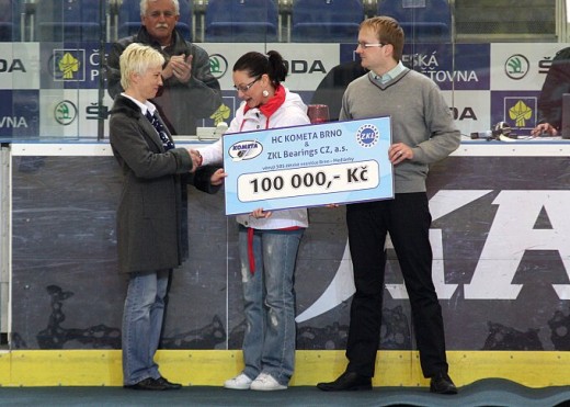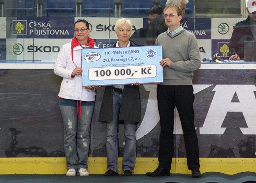The official handover of the cheque took place on Thursday 31 March 2011 on the occasion of the last home match of HC Kometa Brno, which Kometa won 5:4. The cheque was taken over by Mrs. Marcela Troubilová, the Director of SOS Children's Villages Brno, from Mr. Adam Šotek, Financial Manager of ZKL Group.