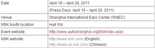 NSK to Exhibit at Auto Shanghai 2011-NSK Technology Contributes to Environment and Automotive Safety