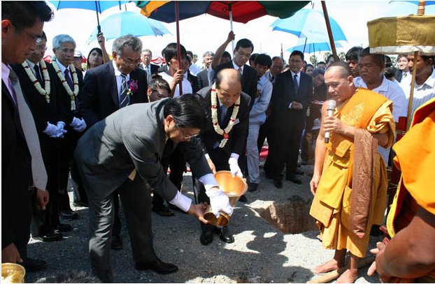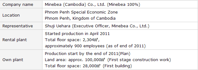 In December 2010, as the first motor manufacturer in Cambodia, Minebea was granted operation permit by the Cambodian government, and on April 1, 2011, began small-scale production at a rental plant (total floor space: 2,304㎡) within the PPSEZ. The new plant, whose groundbreaking ceremony was held today, is the first building of the Company's own plant (total floor space: 28,000㎡, planned to operate by the end of 2011). Going forward, including the addition of second and subsequent buildings, Minebea plans to invest a total of ¥5 billion in plant and equipment, and make the plant a large-scale mass-production facility with a maximum of 5,000 employees.