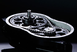 A major contribution to the drive's overall efficiency is made by the chains, through which the tensile forces are transmitted only in the direction of travel. A spur wheel with helical gearing, used for noise reduction, would induce additional, lateral forces and thereby reduce overall efficiency.