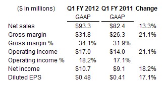Operating income for the first quarter of fiscal 2012 was $17.0 million, an increase of 21.1% compared to operating income of $14.0 million for the same period last year. As a percentage of net sales, operating income was 18.2% compared to 17.1% for the same period last year.
