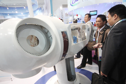 INTERESTED AUDIENCE: Visitors look at models of wind power generation sets at China Wind Power 2011 in Beijing. The exhibition is now the world's third biggest and Asia's biggest (ZHU XINGXIN)