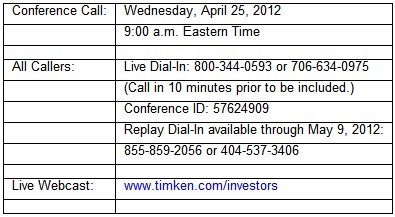 Timken to Announce First-Quarter 2012 Financial Results on April 25