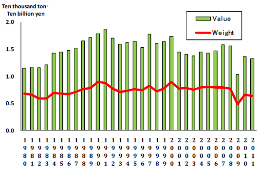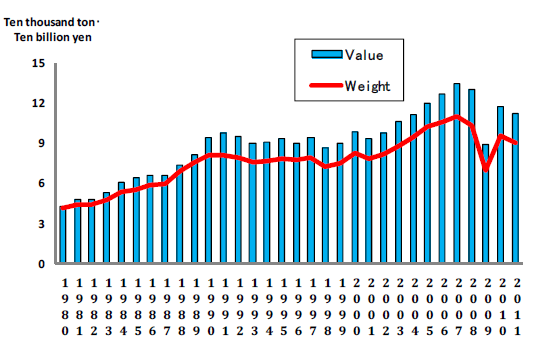 Fig. 2 Production of structural PM parts in Japan in tonnes and sales value (Courtesy: JPMA)