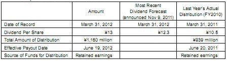 Effective beginning the second half of FY2011, we have increased our dividend payout ratio to 25% from 20%. This change to our shareholder return policy was announced November 9, 2011. The decision to increase shareholder returns resulted from a comprehensive review that took into account the business environment and performance trends and forecasts, as well as the levels of balance-sheet strength, capital efficiency and retained earnings required to establish a stable financial standing over the long-term, among other factors.