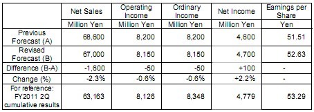 We have revised our consolidated net income forecast as a result of the transfer of shares in a subsidiary. Dividend-per-share forecasts have been revised to ¥ 13.16 (up ¥ 0.26 compared with the previous forecast) for the end of 2Q, ¥ 14.44 fr the year-end (down ¥ 0.12) and ¥ 27.60 (up ¥ 0.14) for the full year, respectively.