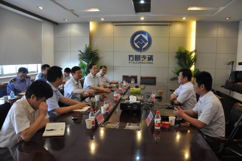 On the afternoon of May 16, Jin Qijian, head of Anhui Provincial Trade and Industry Bureau, and his entourage visited Maanshan Fangyuan Slewing Ring Co., Ltd. acompanied by Gao Xiaoping, deputy mayor of Maanshan. Qian Lisen, general manager of Fangyuan Slewing Ring received the guests.