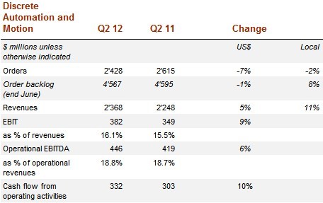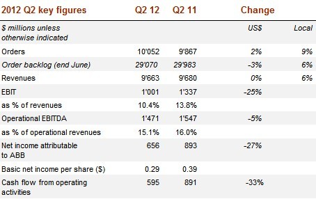 Orders declined in the quarter compared to the strong second quarter a year earlier, mainly reflecting lower demand from the renewable energy and rail sectors as well as reduced demand in China and southern Europe. Orders continued to grow in North America, including a double-digit increase in orders for ABB’s low-voltage drives. North American order growth benefited from the distribution channels of Baldor Electric, in line with the growth synergies expected when Baldor was acquired at the beginning of 2011.