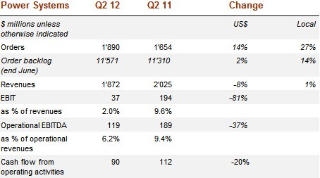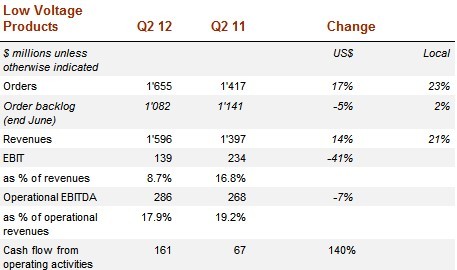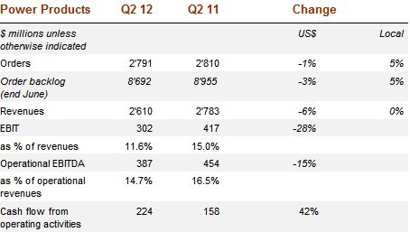 Operational EBITDA in the second quarter of 2012 amounted to $1.5 billion, a decline of 5 percent over the year-earlier period. Included in operational EBITDA is a contribution of approximately $60 million from Thomas & Betts. The decline was mainly due to negative foreign exchange translation impacts of approximately $100 million and an unfavorable business mix; cost savings effectively offset pricing pressure and net project margin slippages in the Power Systems division, while higher investments in sales and R&D helped generate offsetting volume gains.