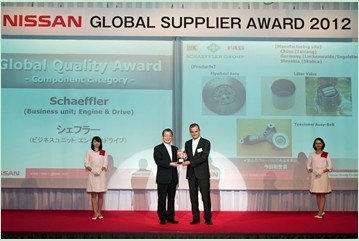Schaeffler was honored first and foremost for good cooperation and communication, as well as for the production quality of its engine components and dual mass flywheels. Nissan COO Toshiyuki Shiga presented the prestigious award to Matthias Zink, President of Schaeffler Automotive Asia-Pacific, during a ceremony attended by more than 240 suppliers and over 800 guests. "As a global supplier of complex components, it is a great honor for us to receive this award. It is both a demonstration of the close cooperation between our two companies and recognition of the outstanding commitment shown by our teams worldwide. The award is a further incentive for us to continue on this path as a strong partner to Nissan, and to continue to fulfill the Japanese quality standards with above-average performance", explained Matthias Zink at Yokohama's Royal Park Hotel.