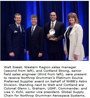 August 13, 2012 (Laconia, NH) - For the fourth time NHBB's Astro Division was named a Platinum Source Preferred Supplier by Northrop Grumman Corporation. The award recognizes Astro for attaining distinction in product quality, on-time delivery, customer satisfaction, and robust lean processes.