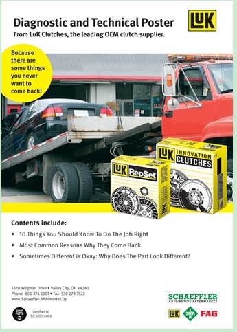 Schaeffler Group USA Inc. has initiated the distribution of more than 180,000 LuK branded technical assistance posters promoting the proper diagnosis and installation of clutch kits, clutch hydraulics and flywheels. The poster helps the technician identify common installation errors that lead to unwarranted product returns and reduction in productivity at the shop level. The technical information for the poster came directly from the Schaeffler Automotive Aftermarket Technical Hotline that helps consumers with proper installation techniques and trouble shooting difficult applications.