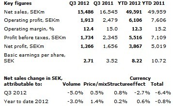 You will find all information regarding SKF Nine-month results 2012 on the IR website.
