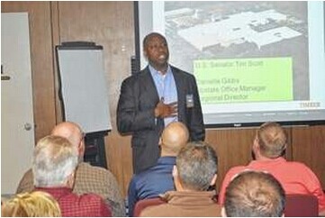 Timken Tyger River Plant Manager Bob Hart introduced Scott to a group of employees in the plant’s conference room before taking Scott on a tour of the plant to meet other employees.