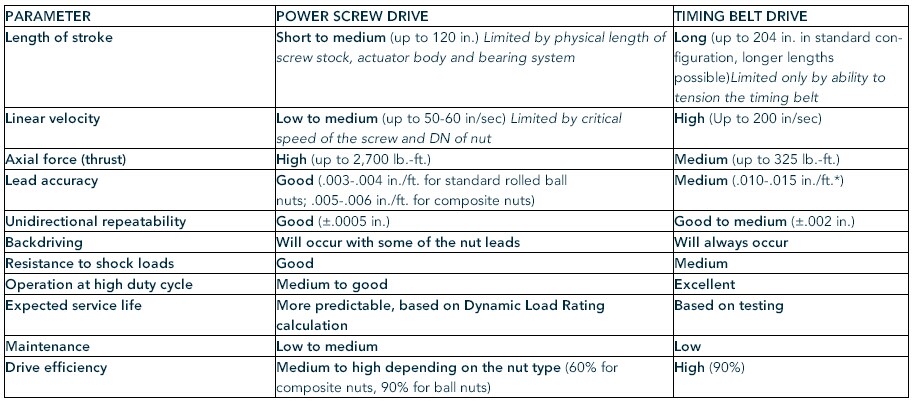 Many applications make the choice of a linear drive easy. For example, timing belt drives are ideal for long-stroke applications requiring high linear velocity and acceleration. The length of stroke of a timing belt actuator is limited only by the ability to efficiently tension long strands of timing belt. If the application stroke length and speed are moderate, but the axial thrust is high, and (or) if a high positional accuracy is required, then power screw drives are an ideal fit.