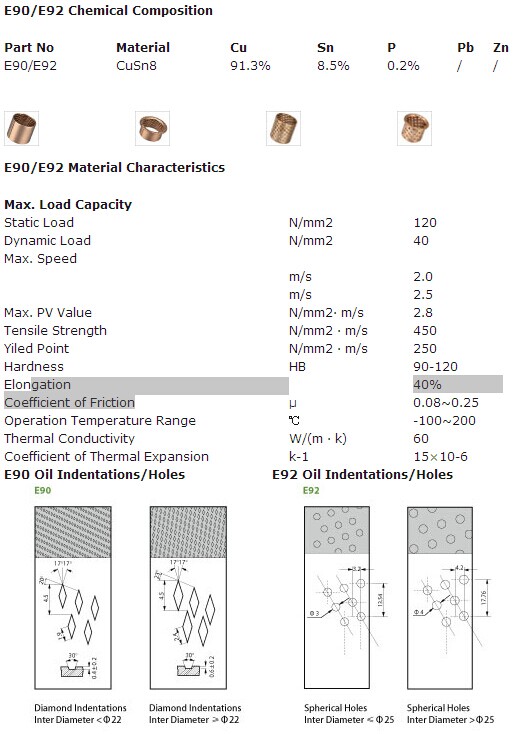 E92 is deriving from E90; the difference between E90 & E92 is Indentations on working surface, which substituted by Through-holes. Theses holes will allow greater capacity to collect lubricant, which build up a lubrication film at the start of movement and reduce the frication. It is suitable for high load, lower speed application like construction, Transport, and agriculture machinery.