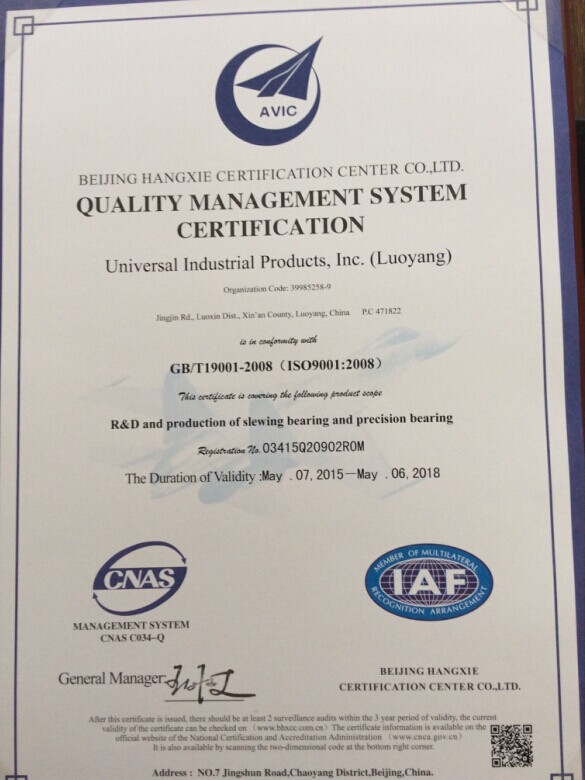 Slewing bearing manufacturer UIPI awarded with CNAS C034-Q Certification (pic)