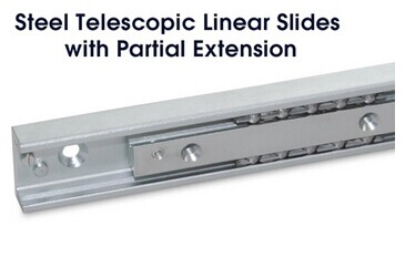 These RoHS-compliant telescopic linear slides are used, for example, for storage drawers and sliding doors, or in jigmaking for a sliding motion in a linear direction. If the support screw is removed on both sides, the sliding distance extends the length of the rail plus an additional distance of slightly more than half the length of the rail. External elements should limit the maximum sliding distance; the supports of the rail have been designed to guard against the inadvertent extraction of the runner from the rail.
