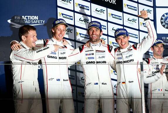 Andreas Seidl, Brendon Hartley, Mark Webber and Timo Bernhard celebrating the win of the manufacturers’ classification.